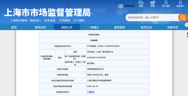 上海市市场监督管理局网站显示,近日,无印良品(上海)商业有限公司因无理由退货违法行为,被上海市普陀区市场监督管理局罚款5000元并警告。